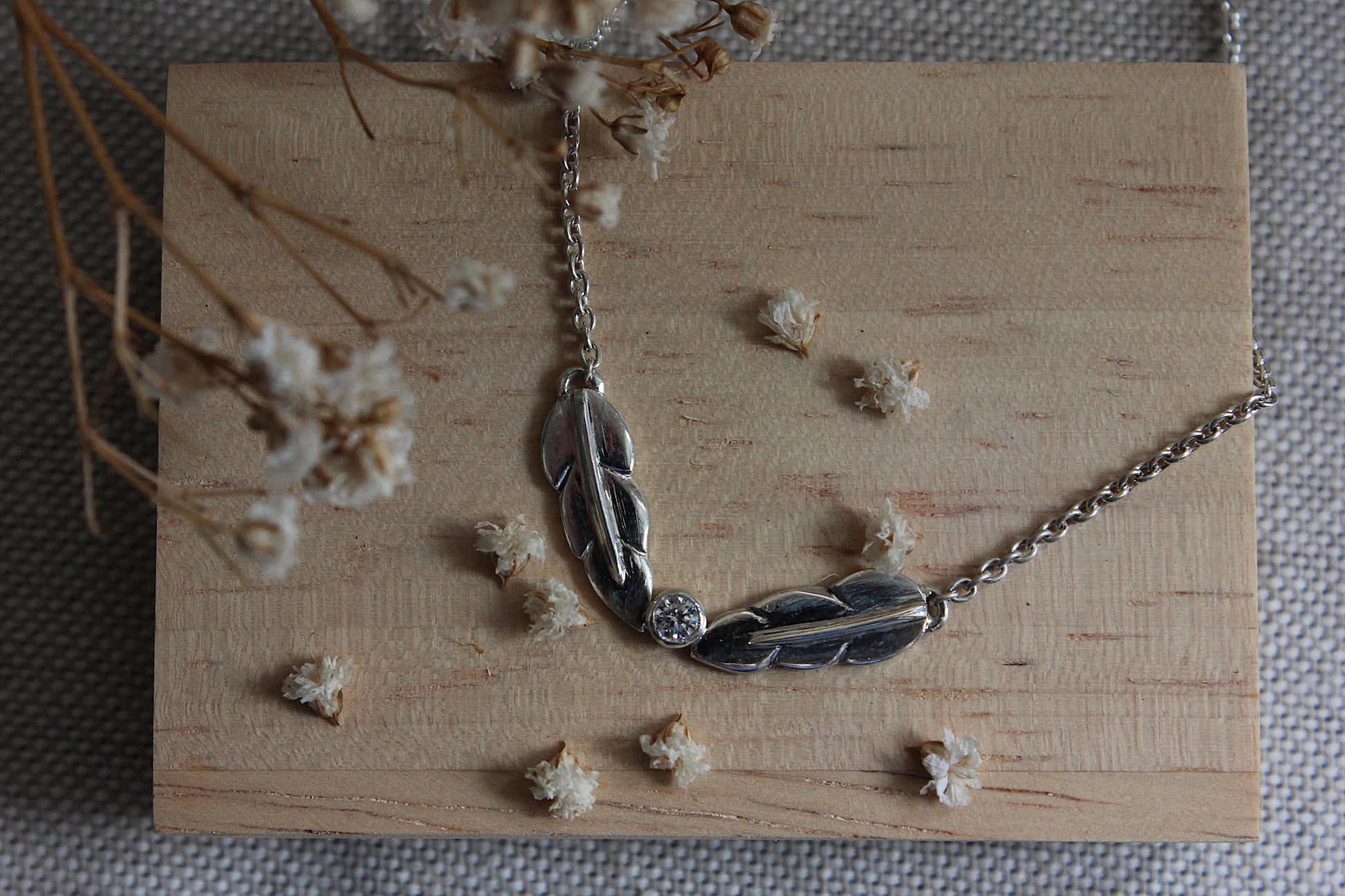 Ce collier est un bijou en argent travaillé à la main. Il s'inspire de la douceur de la nature. Les deux feuilles délicates se rejoignent harmonieusement. Un zircon scintillant ajoute une touche de lumière. Parfait pour les amoureux de la nature et de l'artisanat.